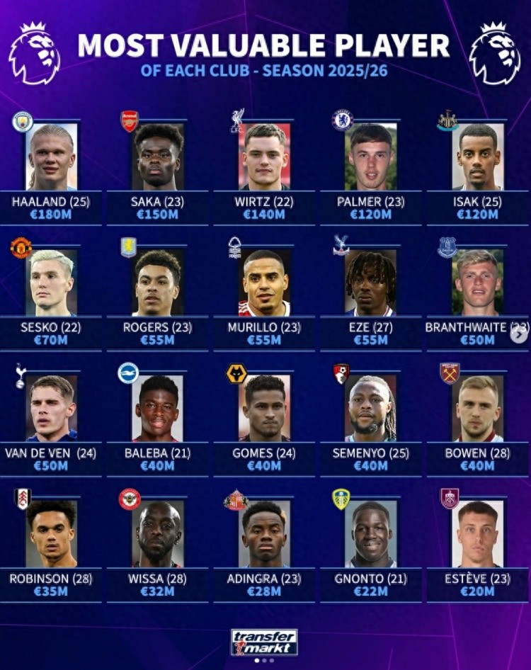 ngày 17 tháng 8, mùa giải mới của Premier League đã mở, và Đức cũng tính các cầu thủ có giá trị nhất trong số 20 đội Premier League, bao gồm Haaland dẫn đầu bởi 180 triệu euro, như sau: