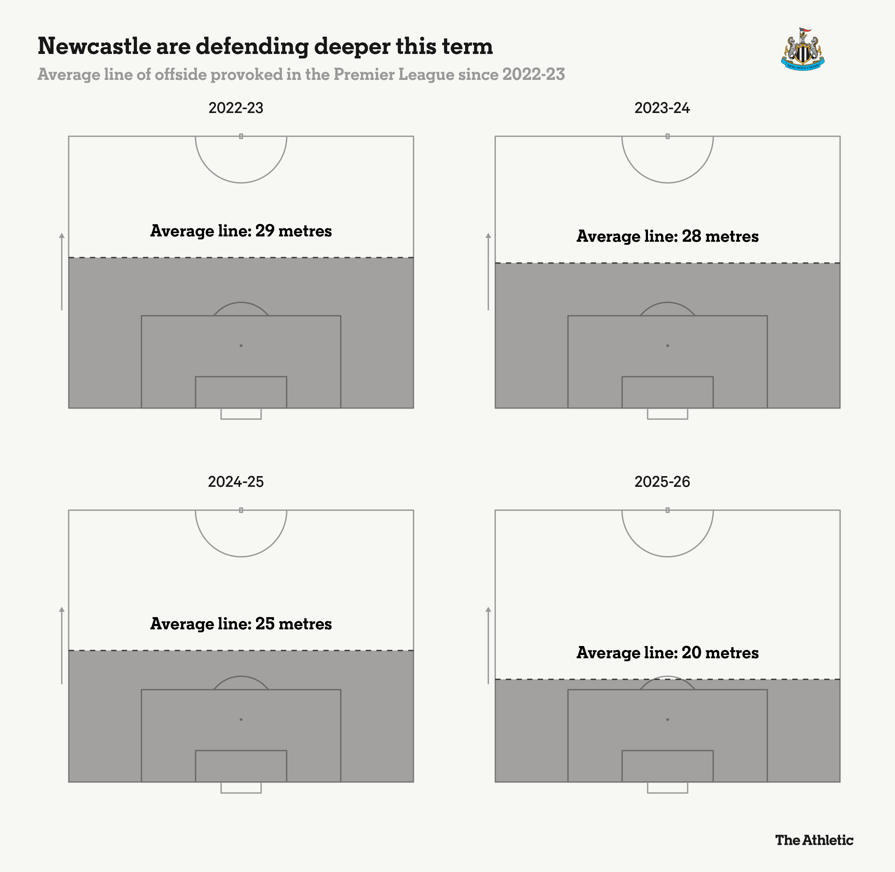 Về mặt phòng ngự, hàng phòng ngự của Newcastle đã rút lui (như hình bên dưới). Dù đã giữ sạch lưới 5 trận nhưng số bàn thua dự kiến (xGA) của họ vẫn tiếp tục giảm.
