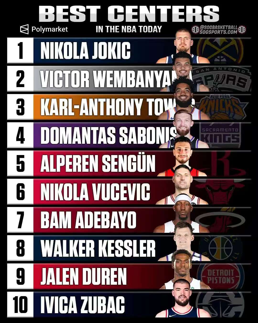 Mười trung tâm hàng đầu là: 1 Jokic, 2 Wenban, 3 Towns, 4 Sabonis, 5 Shen Jing, 6 Vucevic, 7 Adebayor, 8 Kessler, 9 Duren, 10 Zubac. Là cầu thủ số một của giải đấu đang hoạt động, Jokic không gặp vấn đề gì khi xếp hạng ở vị trí này. Anh ấy vẫn đang ghi trung bình triple-double mỗi trận trong mùa giải này, điều này thật đáng kinh ngạc. Wenban đã gia tăng số bàn thắng ở mùa giải này. Nó từng đạt vị trí đầu tiên trong danh sách MVP. Với sự cải thiện về phòng ngự + tấn công hàng đầu, nó đã rất mạnh trong năm thứ ba.