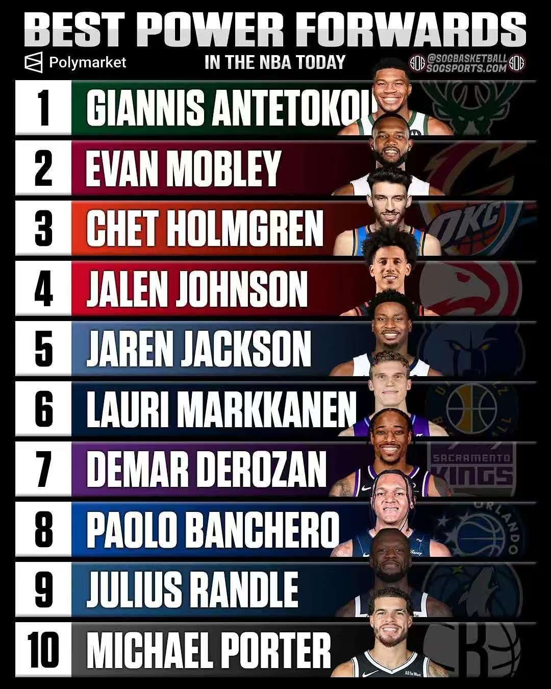 Mười power Forward hàng đầu là: 1 Antetokounmpo, 2 Mobley, 3 Cutt, 4 Jaylen Johnson, 5 Jaren Jackson, 6 Markkanen, 7 DeRozan, 8 Banchero, 9 Randle, 10 Porter Jr. Không còn nghi ngờ gì nữa, Alphabet đứng đầu. Mùa giải này, Alphabet đã thể hiện phong độ tốt nhất trong sự nghiệp của mình. Suy cho cùng, anh ấy là một trưởng nhóm nòng cốt. Muốn đạt được kết quả tốt thì phải sử dụng hết hỏa lực của mình. Mobley là một trong những tiền đạo phòng ngự tốt nhất hiện đang hoạt động và đã giành được giải thưởng Cầu thủ phòng ngự xuất sắc nhất năm của giải đấu mùa trước.