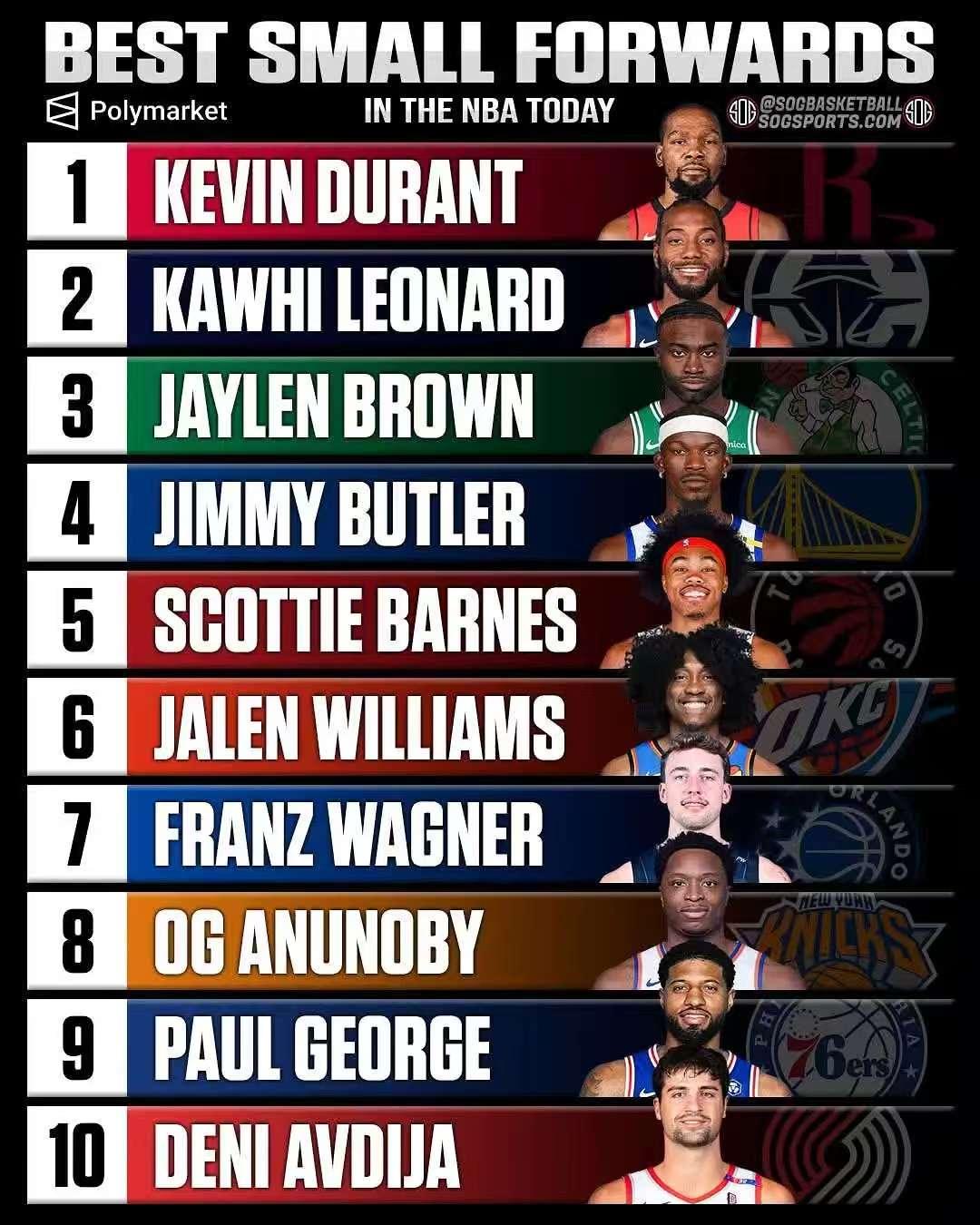 Mười tiền đạo nhỏ hàng đầu là: 1 Durant, 2 Leonard, 3 Brown, 4 Butler, 5 Barnes, 6 Jaywe, 7 Flagg, 8 Anunoby, 9 George, 10 Avdija. Sau khi Durant gia nhập Rockets, anh đã chứng minh rằng mình vẫn là một trong những cầu thủ ghi bàn tốt nhất giải đấu. Anh ấy đã mang lại cho Rockets sự cải tiến lớn nhất. Tôi nghĩ chính anh ấy là người thu hút hàng phòng ngự và tạo ra những cơ hội ghi bàn dễ dàng cho đồng đội. Leonard mùa này vẫn rất ổn định, nhưng anh không còn phong độ đỉnh cao và lại dính chấn thương gần đây.