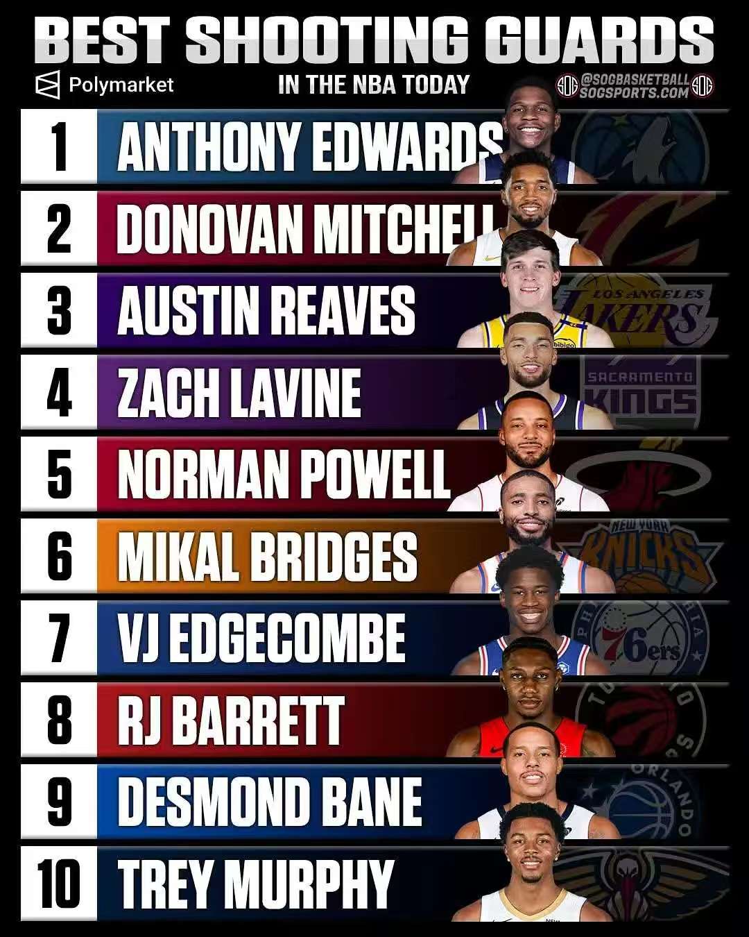 Mười vị trí hậu vệ bắn súng hàng đầu là: 1 Edwards, 2 Mitchell, 3 Xiaoli, 4 LaVine, 5 Powell, 6 Bridges, 7 Edgecomb, 8 Barrett, 9 Bane, 10 Trey Murphy. Edwards vẫn là hậu vệ bắn súng số một trong giải đấu đang hoạt động. Không có nghi ngờ gì về điều này. Mùa giải này, Hua Zi đã cải thiện khả năng tầm trung và củng cố kho vũ khí tấn công của mình. Mitchell là một trong những cầu thủ ghi bàn bùng nổ nhất giải đấu hiện tại.