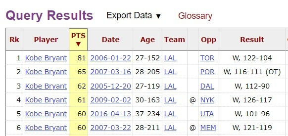 Kobe đã ghi hơn 40 bàn thắng trong 122 lần trong sự nghiệp của mình, trong đó có 6 trận có chỉ số 60+. Trận đấu nổi tiếng nhất là trận đấu ghi 81 điểm của anh ấy trước Raptors.