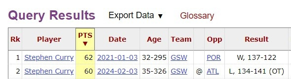 Curry đã ghi hơn 40 điểm 74 lần trong sự nghiệp, trong đó có hai trận đạt trên 60 điểm. Vào tháng 1 năm 2021, Curry ghi được 62 điểm trước Trail Blazers.