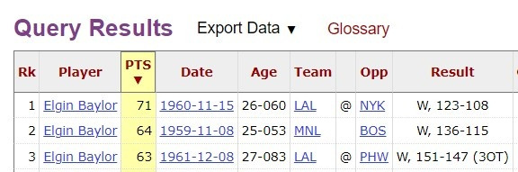 Baylor đã ghi hơn 40 điểm 88 lần trong sự nghiệp, trong đó có 3 trận đạt trên 60 điểm. Số điểm cao nhất là 71 điểm trước Knicks.