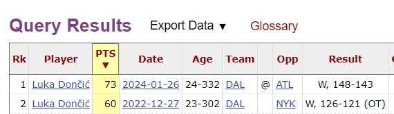 Doncic cũng đã có 50 trận đạt trên 40 điểm trong sự nghiệp, trong đó có hai trận đạt trên 60 điểm. Vào tháng 1 năm 2024, trong trận đấu với Hawks, Doncic ghi được 73 điểm, 10 rebound và 7 kiến tạo.